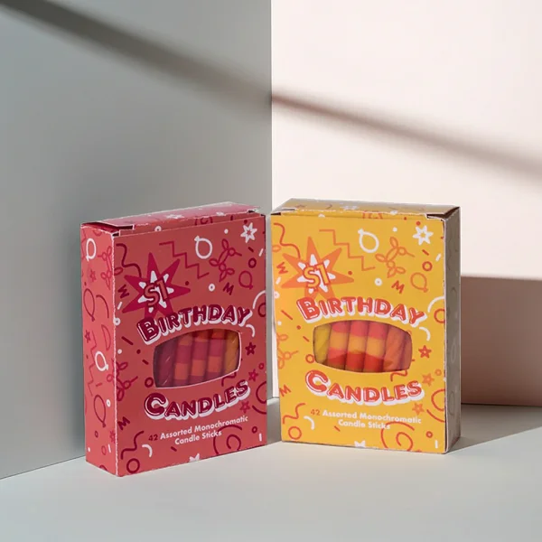 Pro Tip: Die-cut birthday candle boxes with windows allow customers to see the candle inside while maintaining protection.